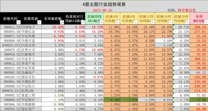 行业方面,芯片、电子信息类暴涨,全指信息这种大行业指数等能暴涨9.92%;CS食品饮料这种消费类指数开始大反弹补涨,收3.57%;垫底的是地产、银行等微涨。